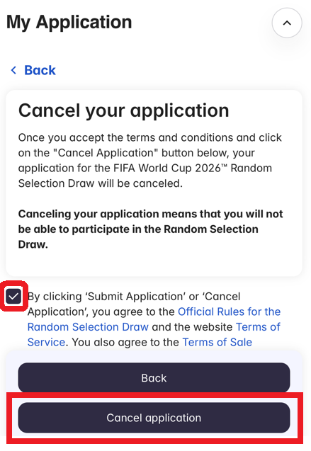 再度Random Selection Drawをクリックすると、自分が抽選したカードの画面になりますので、その中にあるCancel applicationをクリックしてください。