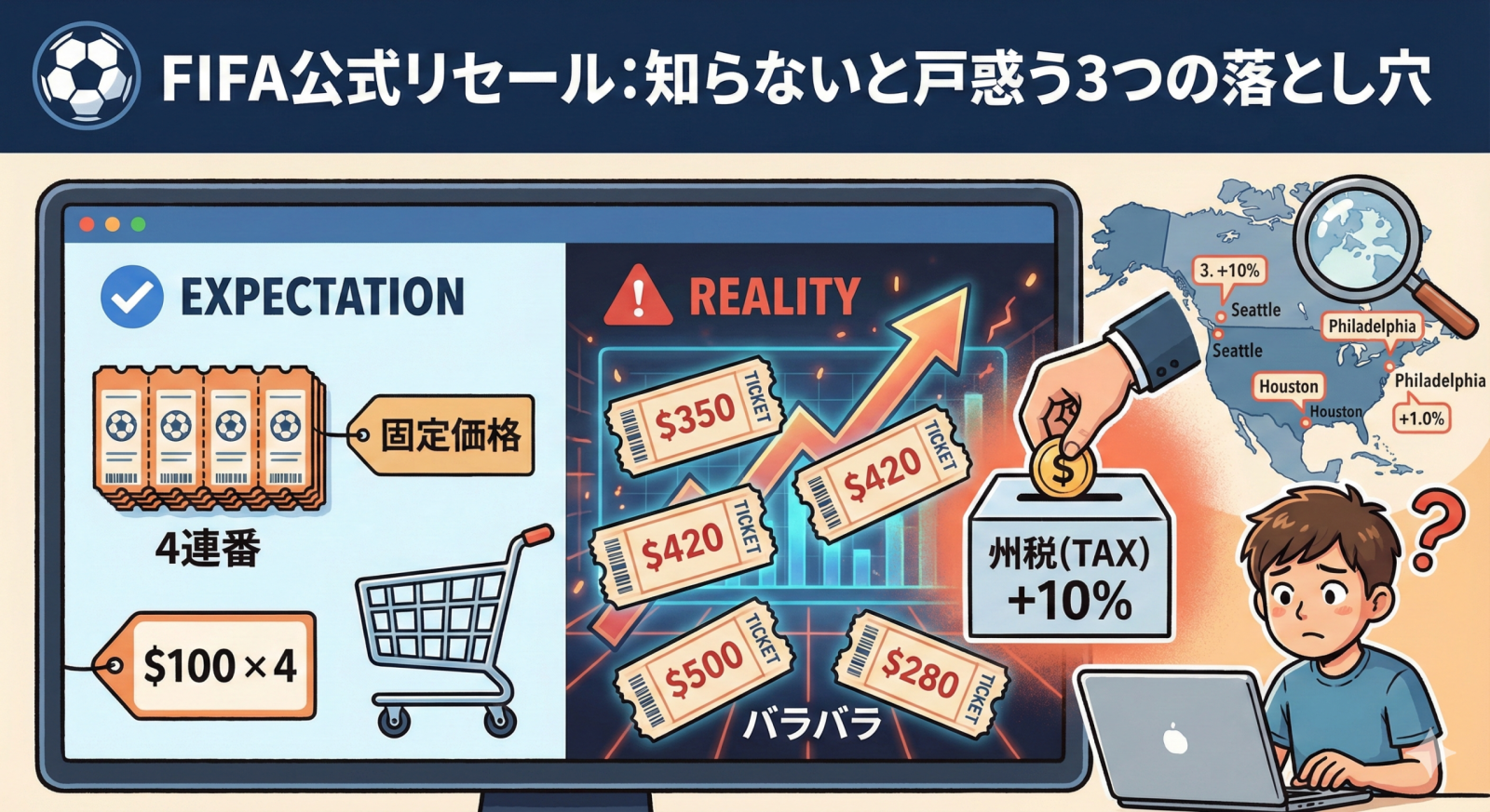 このページでは、FIFA公式サイトでの購入手順、価格帯、リセールの仕組み、そして筆者自身の失敗談まで、実体験に基づいた情報を網羅しています。