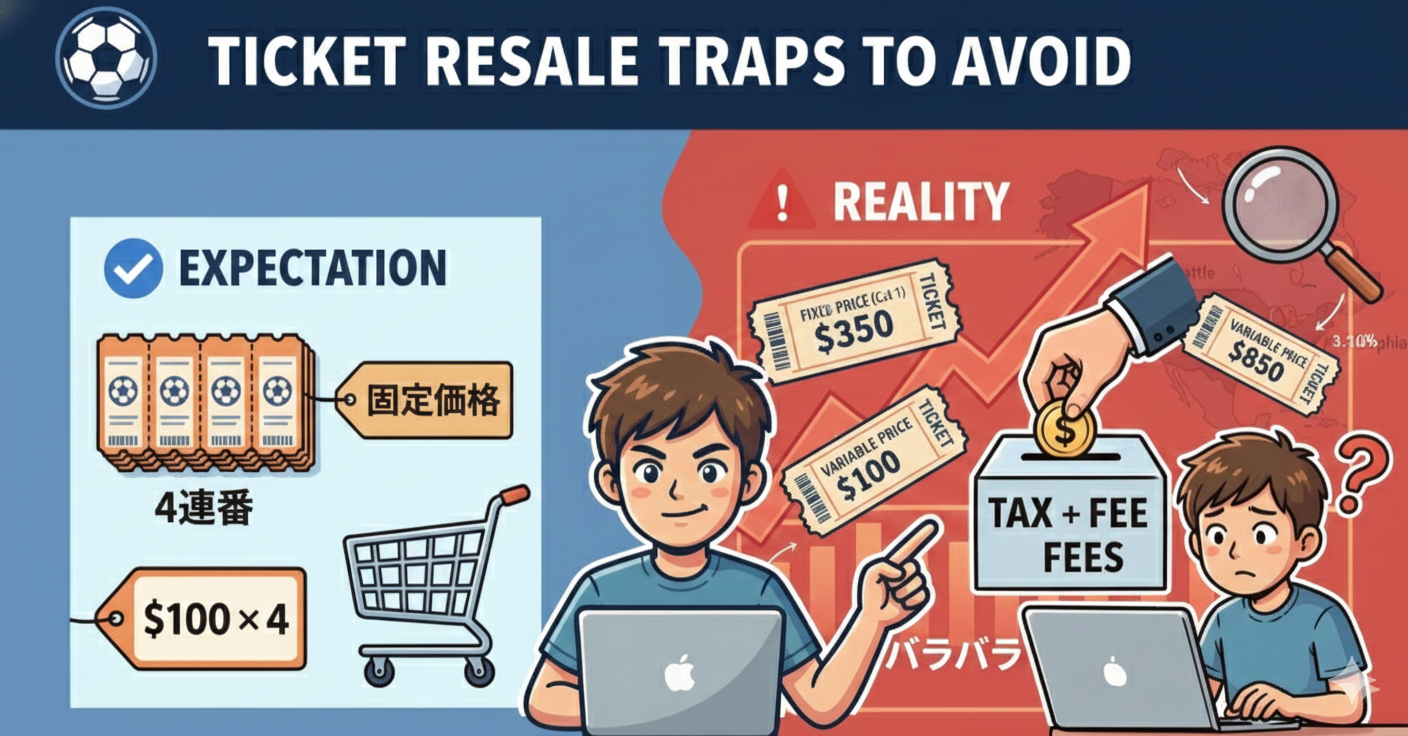 StubHub、viagogo、メルカリなどの非公式プラットフォームで販売されているチケットは、入場を拒否されるリスクがあります。FIFAはチケットの転売を公式リセール以外では認めておらず、非公式チケットは無効化される可能性が高いです。